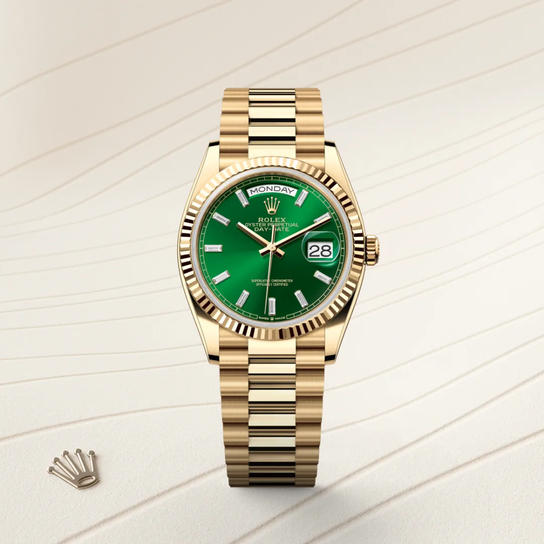 The Rolex fluted bezel is a mark of distinction. Originally, the fluting of the Oyster bezel had a functional purpose: it served to screw the bezel onto the case helping to ensure the waterproofness of the watch. It was therefore identical to the fluting on the case back, which was also screwed onto the case for waterproofness, using specific Rolex tools. Over time, the fluting became an aesthetic element, a genuine Rolex signature feature. Today the fluted bezel is a mark of distinction, in gold on this Day-Date 36.