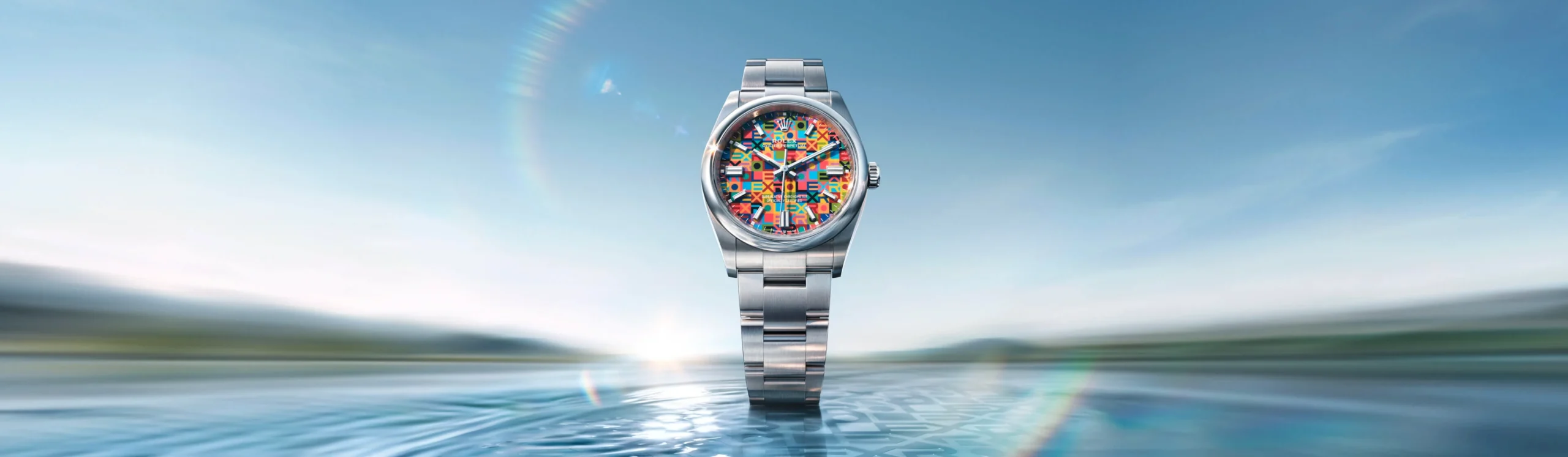 Rolex memperkenalkan versi baharu Oyster Perpetual 36 dalam warna Oystersteel dengan permukaan yang dihiasi motif Jubilee yang sarat dengan grafik dan berwarna-warni serta memaparkan huruf-huruf nama Rolex.