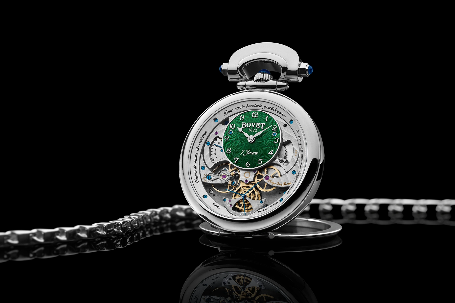 Raffy intended to showcase BOVET’s mastery of decorative crafts with movements and cases, which were finished to equally high standards on both sides of the watch case. Perhaps inspired by the double hunter pocket watch, which was often used by owners as a desk clock as well by opening both covers as a stand, he conceived the idea of a transformable watch well before this trend took off in the watch and jewellery industries. The patented Amadeo system was presented in 2010 with four different ways of carrying or wearing it: a wristwatch with reversed hand-fitting; a pocket watch (or necklace, a la Flava Flav); and as a table clock, thanks to a hidden hinge on the rear bezel so it doubles as a stand.