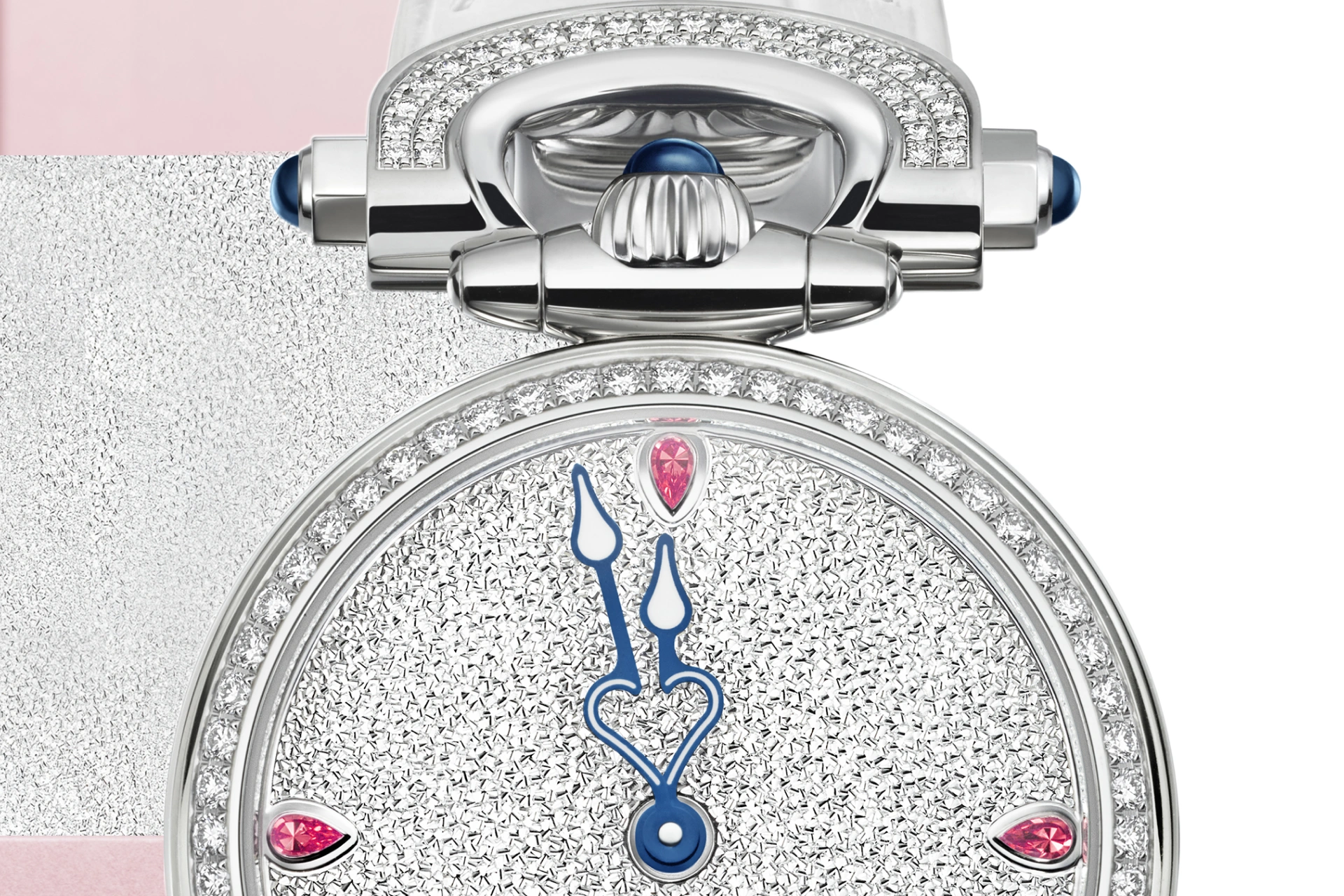 The hand-carved “Bris de Verre” (broken glass) pattern dial resembles pristine fresh snow, glistening in the sunlight with brilliance rivaling that of diamond pavé. Pear-cut pink sapphires are set at the 3, 6, 9, and 12 o’clock positions, exuding joyful vitality that complements the shimmering dial. Paired with heart-shaped blue steel hands coated with white Super-LumiNova, a complete heart forms whenever the two hands meet.