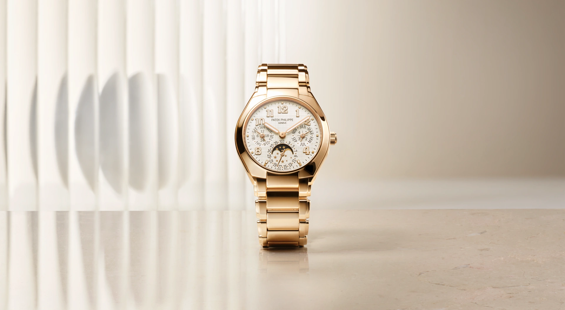 為誌慶系列誕生 25 載,百達翡麗推出 4910/1201R-010,除了採柔美玫瑰金錶殼外,面盤底板飾以同心波浪紋路,覆塗數十層半透明紫漆,引入深邃光影,舉手投足皆精緻耀眼。